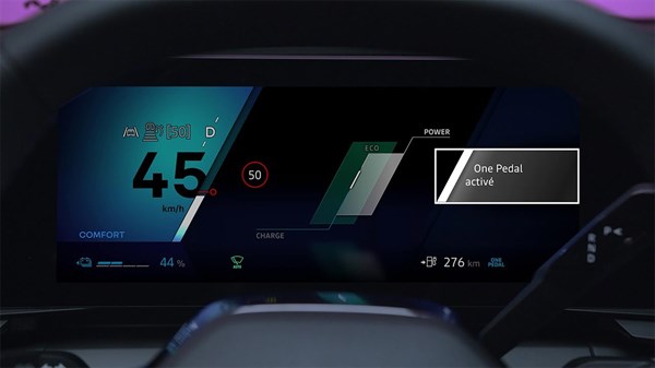 The one-pedal function must be reactivated each time the vehicle is restarted, at the driver’s discretion. If it was active at standstill, the vehicle will automatically restart with a lower level of regenerative braking. As a reminder, one-pedal corresponds to the maximum regenerative braking level, allowing you to come to a complete stop.